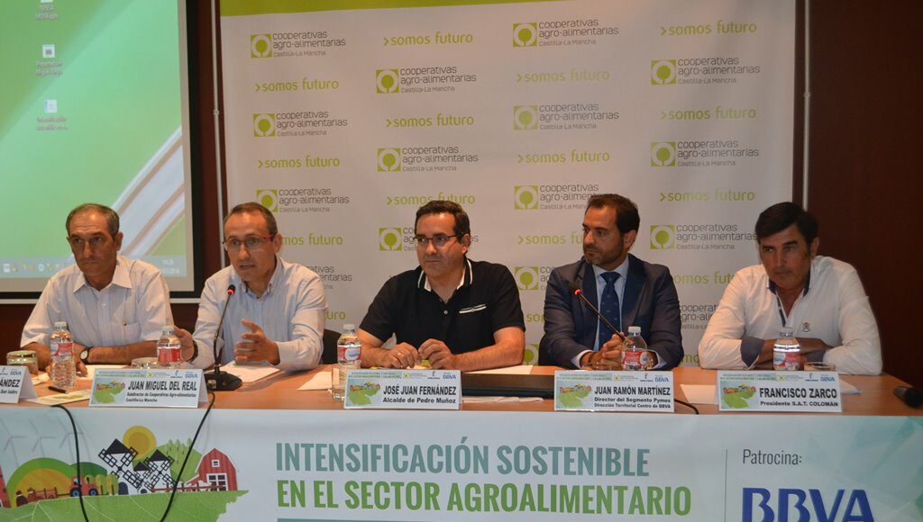 Cooperativas Agro-alimentarias Castilla-La Mancha, con la estrecha colaboración del BBVA, ha celebrado esta mañana en Pedro Muñoz (Ciudad Real) la jornada “Intensificación Sostenible en el Sector Agroalimentario”, que ha contado con la presencia de casi un centenar de rectores, técnicos y socios de cooperativas y ha pretendido trasladar una visión de futuro sobre la continuidad de la actividad agroalimentaria en la región ante los nuevos retos medioambientales y demográficos que han identificado todos los organismos internacionales en este ámbito.