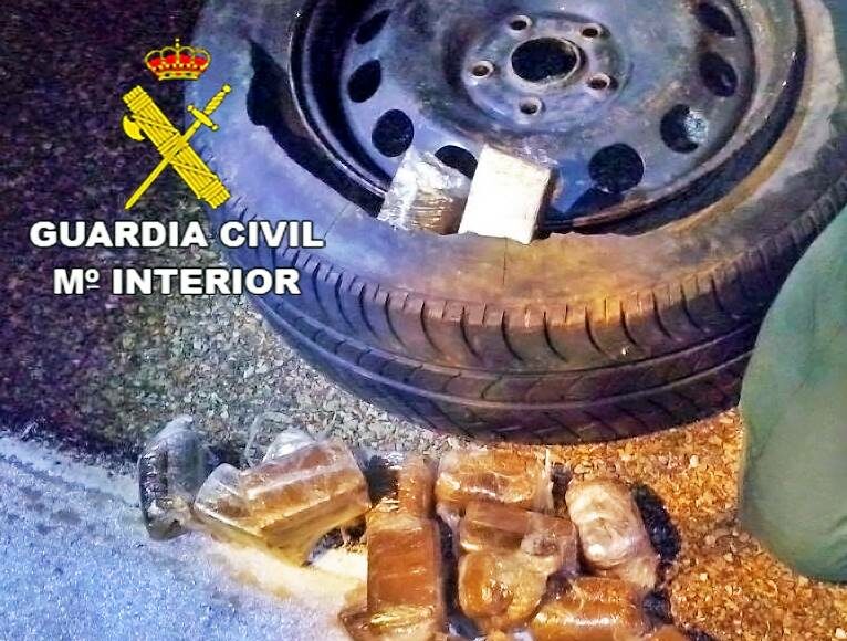 Inmediatamente Agentes de dicha Unidad procedieron a desmontar la rueda de repuesto encontrando en su interior 29 paquetes de hachís, los cuales arrojaron un peso total de 5,740 kilogramos.