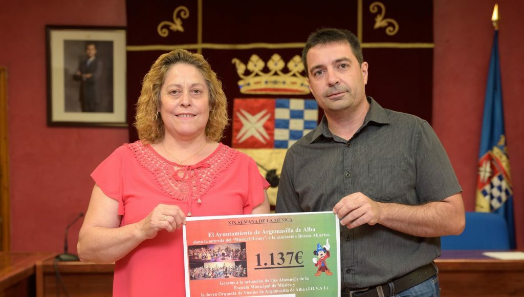 El concejal de Cultura del Ayuntamiento de Argamasilla de Alba, José Antonio Navarro, ha hecho entrega a la presidenta de la Asociación Pro-Minusválidos “Brazos Abiertos” de la localidad, Alfonsa Condes, de los 1.137 euros recaudados gracias al espectáculo ‘Musical Disney’, que realizaron con gran éxito el sábado 17 de junio los alumnos y alumnas de la Escuela Municipal de Música, dirigidos por las profesoras María Dolores Redondo y Beatriz Rubio, y la Joven Orquesta de Vientos de Argamasilla de Alba (JOVAL), al frente de ella su director titular, Miguel Carlos Gómez, y la subdirectora, Beatriz Campo.