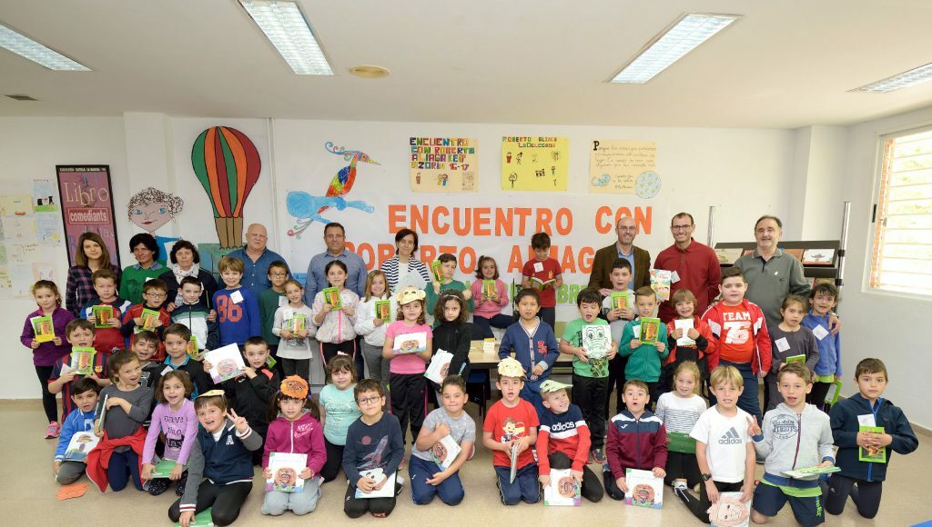 Dentro de las actividades programadas con motivo del Día del Libro y de la semana cultural, el pasado lunes 24 de abril, los alumnos y alumnas del CEIP Azorín tuvieron un encuentro con el escritor local de literatura infantil, recientemente galardonado con el premio El Barco de Vapor 2017, Roberto Aliaga, por la obra Cómo arreglar un libro mojado, dirigida a lectores entre 8 y 11 años.