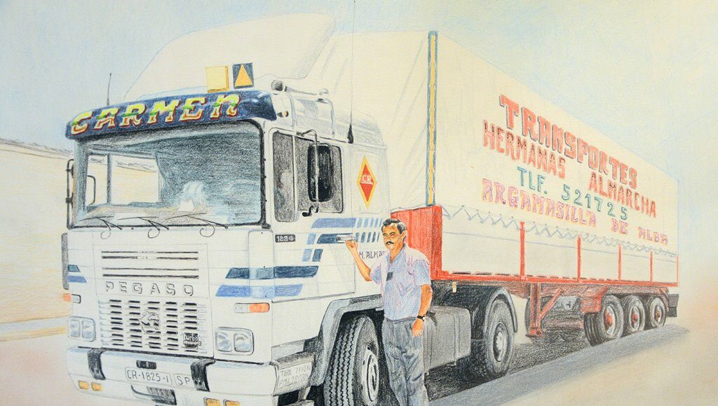 Es conocida la estrecha relación existente entre los camioneros y sus herramientas de trabajo, pues muchos de ellos pasan más tiempo en ellas que en sus propias casas, tanto si hablamos del día como de la noche. Por ello, Sindo, camionero de profesión, ha querido mostrar los camiones que de una forma u otra han formado parte de su vida o han influido en ella y con los que ha soñado e imaginado decorar con su aerógrafo, una técnica que desarrolló hace años y de la que es un auténtico maestro, aunque para esta ocasión se ha decantado por otras como el pastel, el óleo y sobre todo los lápices de colores.