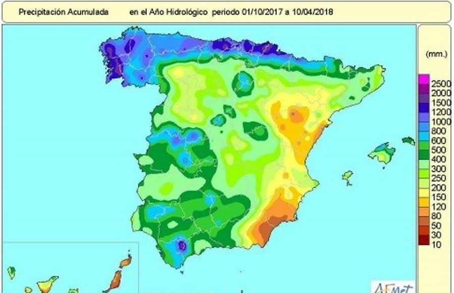 Las lluvias acumuladas desde que comenzó el año hidrológico (1 de octubre de 2017) alcanzan 484 litros por metro cuadrado, lo que supone un 15 por ciento más que el valor normal que correspondería a este periodo hasta el 10 de abril, según ha informado la Agencia Estatal de Meteorología (AEMET).