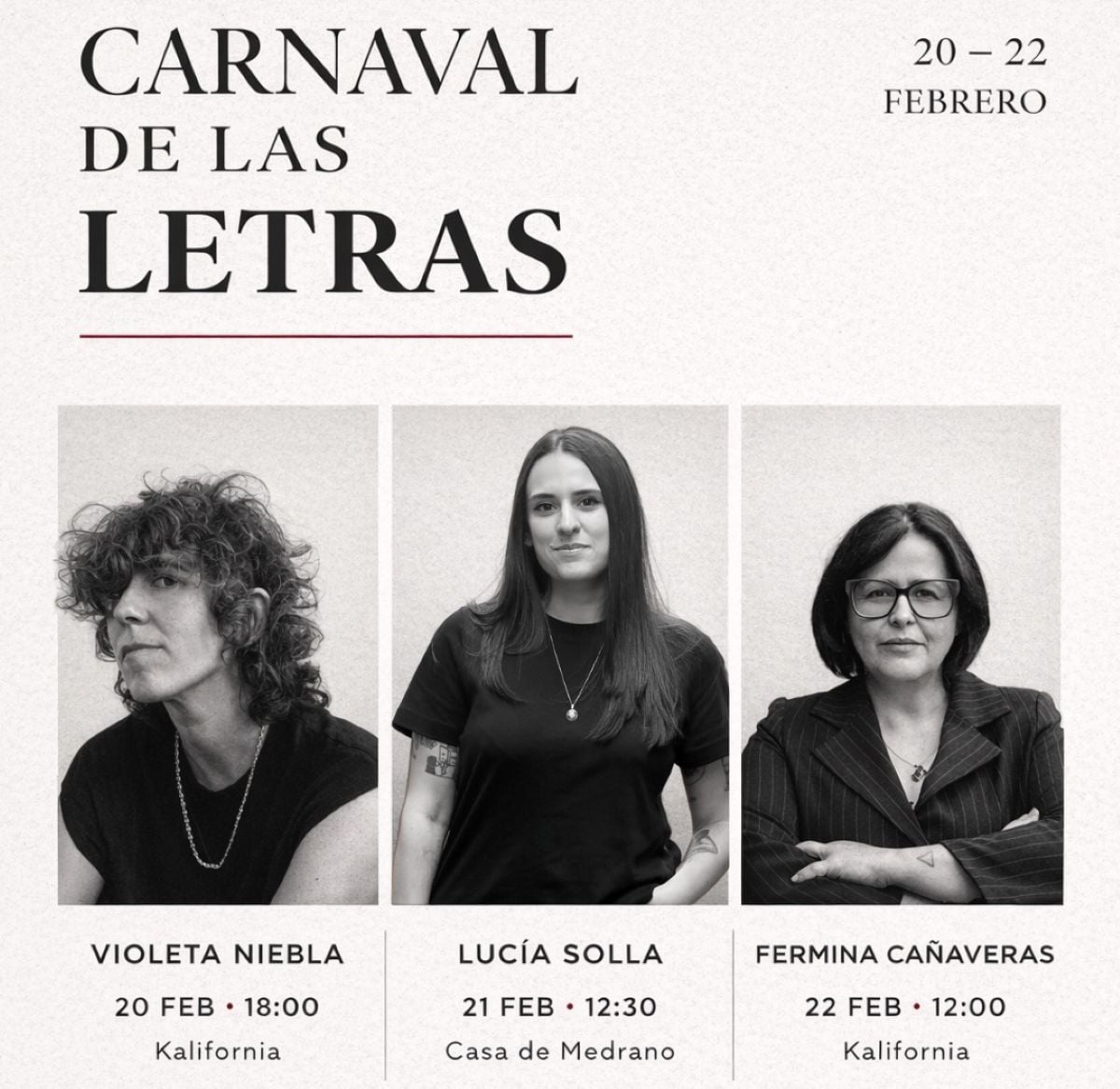 A lo largo de tres jornadas consecutivas se celebrarán presentaciones y encuentros literarios, todos ellos con entrada libre hasta completar aforo. La programación arrancará el viernes 20 de febrero, a las 18.00 horas, con la presentación de Todo lo que hice por dinero, de Violeta Niebla, en la librería Kalifornia. El sábado 21 de febrero, a las 12.30 horas, será el turno de Lucía Solla, que presentará Comerás flores en el Centro Cultural Casa de Medrano. El ciclo se cerrará el domingo 22 de febrero, a las 12.00 horas, con Fermina Cañaveras y su novela La sonrisa rota, de nuevo en la librería Kalifornia.