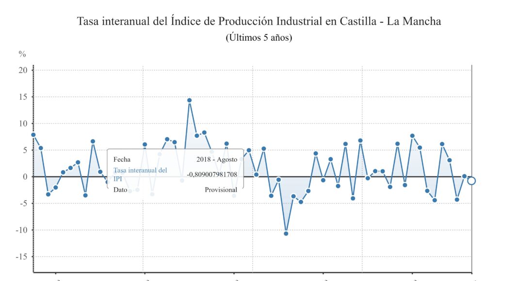 El Índice General de Producción Industrial (IPI) varió en agosto de 2018 en Castilla-La Mancha un -0,81% en relación al mismo mes del año anterior, según ha informado este viernes el Instituto Nacional de Estadística (INE).