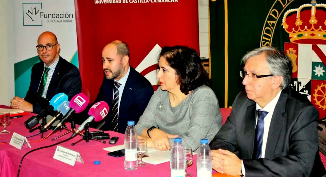 El Termómetro Económico de Castilla-La Mancha ha sido presentado esta mañana en la Facultad de Ciencias Jurídicas y Sociales de Toledo por el gerente de la Fundación Eurocaja Rural, Vicente Muñoz, la vicerrectora de Internacionalización y Formación Permanente de la UCLM, Fátima Guadamillas, el profesor Mario Donate, coordinador del Termómetro, y el catedrático de la UCLM Juan Carlos López, en presencia del director de la División de Relaciones Institucionales de Eurocaja Rural, Miguel Ángel Escalante Pinel.