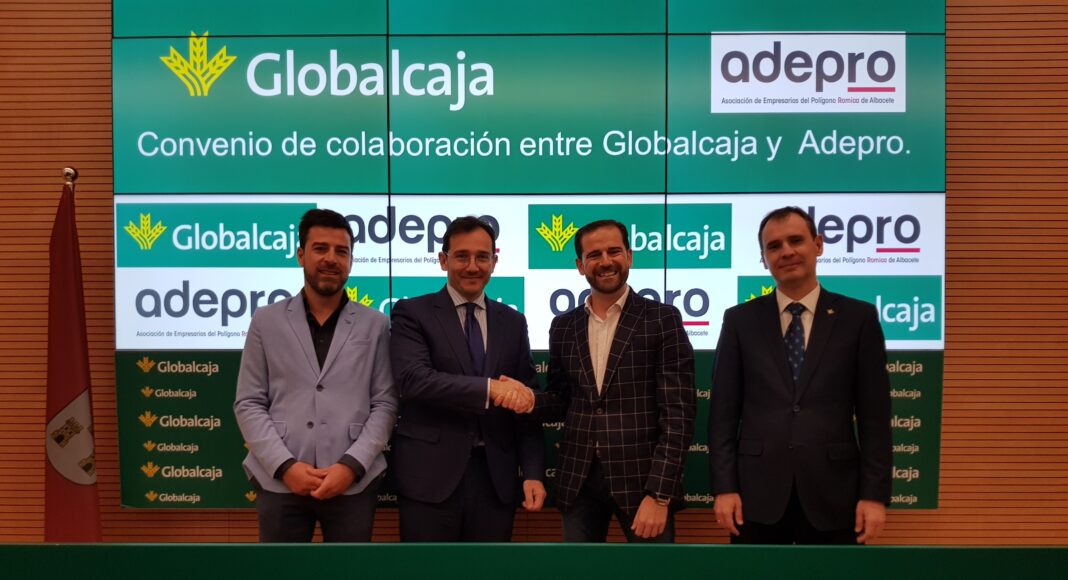 Javier González, director territorial de Globalcaja en la provincia de Albacete, y Pedro Jesús Sáez, presidente de la Asociación de Empresarios del Polígono Romica de Albacete (ADEPRO), han suscrito un convenio de colaboración, con la presencia también, entre otros, del director de Zona de la entidad, Javier Gascón, que tiene el objeto de contribuir a la realización de actividades para el fortalecimiento del sector empresarial de las empresas del Polígono Romica de Albacete, como, por ejemplo, el patrocinio de Asambleas Generales Anuales de ADEPRO- EUC, presentación de la nueva imagen de Romica, nueva web de ADEPRO, videos corporativos, mapa directorio, charlas de promoción de la digitalización de las PYMES en ROMICA.