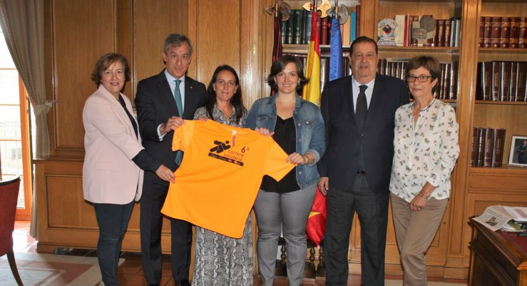 La alcaldesa de Camarena y diputada regional, Rosario García Saco, recibió la camiseta de la Carrera de manos del presidente de Eurocaja Rural, Javier López Martín, la directora de Marketing de Grupo Tello Alimentación, Inés Tello, la directora gerente de AFAEM Despertar, Pilar Sánchez, y la vocal de su Junta Directiva Hortensia Moreno.