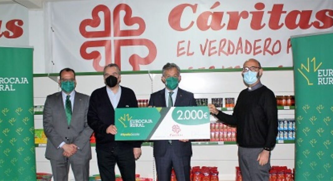 El presidente de la Fundación Eurocaja Rural, Javier López Martín, acompañado del director territorial de Eurocaja Rural en Talavera de la Reina, David López Luna, hizo entrega del reconocimiento al director de Cáritas en Talavera de la Reina, Ricardo Riesco, quien acudió con el sacerdote delegado de Cáritas en Talavera de la Reina, Vicente Domínguez.
