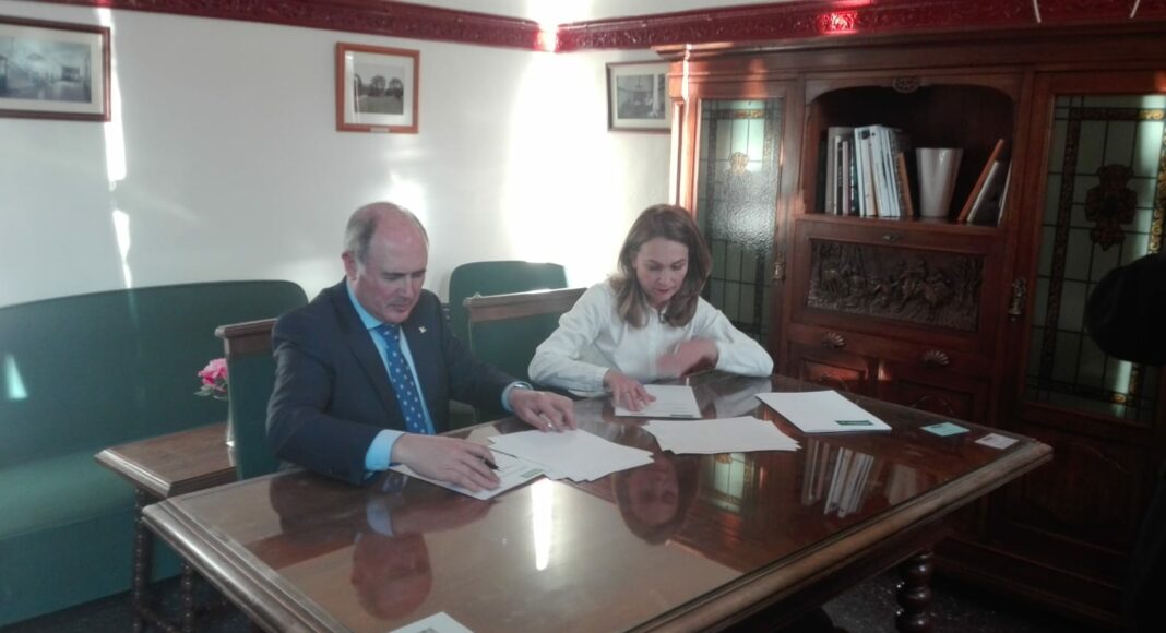 La directora del IES Bachiller Sabuco, Llanos Navarro, y el presidente de la Fundación Globalcaja Albacete, Herminio Molina, han firmado un nuevo acuerdo de colaboración, por el que se destinan recursos para los planes de formación y actualización del profesorado del Bachillerato Internacional que se imparte en dicho centro.