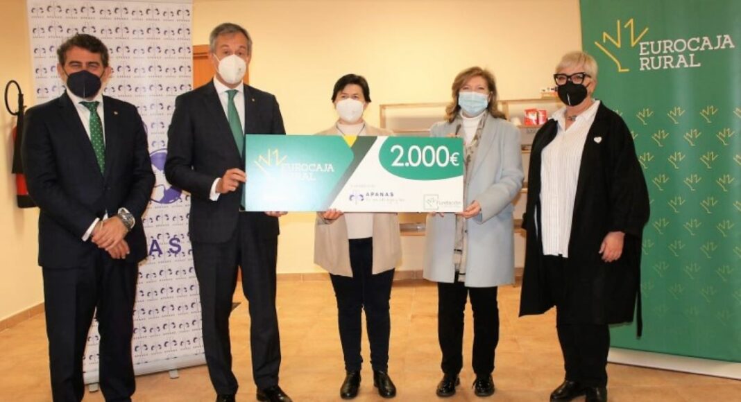 El presidente de la Fundación Eurocaja Rural, Javier López Martín, ha entregado a la presidenta de APANAS, María del Mar Azaña, acompañada de la gerente de la asociación, Sagrario Balmaseda, los 2.000 euros correspondientes a una de las diez ‘Ayudas Sociales a la Empleabilidad’. Este concurso fue convocado para fomentar iniciativas destinadas a la creación de empleo, especialmente dirigidas a los colectivos más afectados por la pandemia.