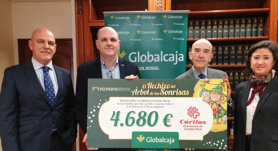 La sede de Globalcaja en Ciudad Real ha acogido la entrega del cheque de la recaudación del espectáculo solidario «El Hechizo del Arbol de la Sonrisas» a Cáritas Diocesana de Ciudad Real, por un importe de 4.680 euros.
