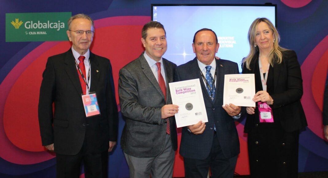Los vinos garnacha tintorera ecológico y el tipo uno garnacha tintorera recibieron dichos reconocimientos, en este concurso que premia los mejores graneles por su calidad. En la imagen, un momento del acto de entrega de los premios que recibió el presidente de la Cooperativa Santa Quiteria, Juan Aparicio, de manos del presidente de Castilla-La Mancha, Emiliano García-Page, con la presencia también del presidente de Globalcaja, Carlos de la Sierra, y la directora general de la WBWE, Otilia Romero de Condés.