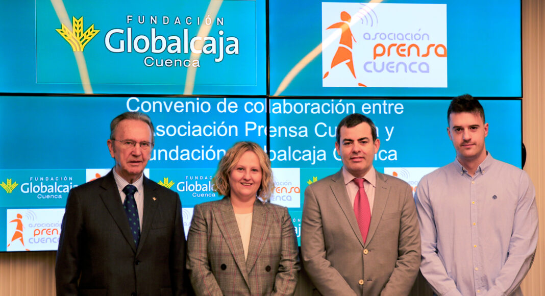 Carlos de la Sierra, presidente de la Fundación Globalcaja Cuenca, y Nuria Lozano, presidenta de la APC (Asociación de Prensa de Cuenca) han suscrito la renovación del acuerdo de colaboración que ambas entidades mantienen anualmente, con motivo de los Premios de Periodismo Local, que este año cuenta ya con su tercera edición. José María Herranz y Juan Ignacio Cantero, tesorero y secretario de la Asociación, respectivamente, han estado presentes también en el momento de la firma.
