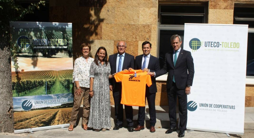 El presidente de UTECO, Encarnación Majano, y su director gerente, José María Manzanilla, recibieron la camiseta naranja de la Carrera de manos del presidente de Eurocaja Rural, Javier López Martín, la directora de Marketing de Grupo Tello Alimentación, Inés Tello, y la vocal de la Junta Directiva de AFAEM Despertar Hortensia Moreno.