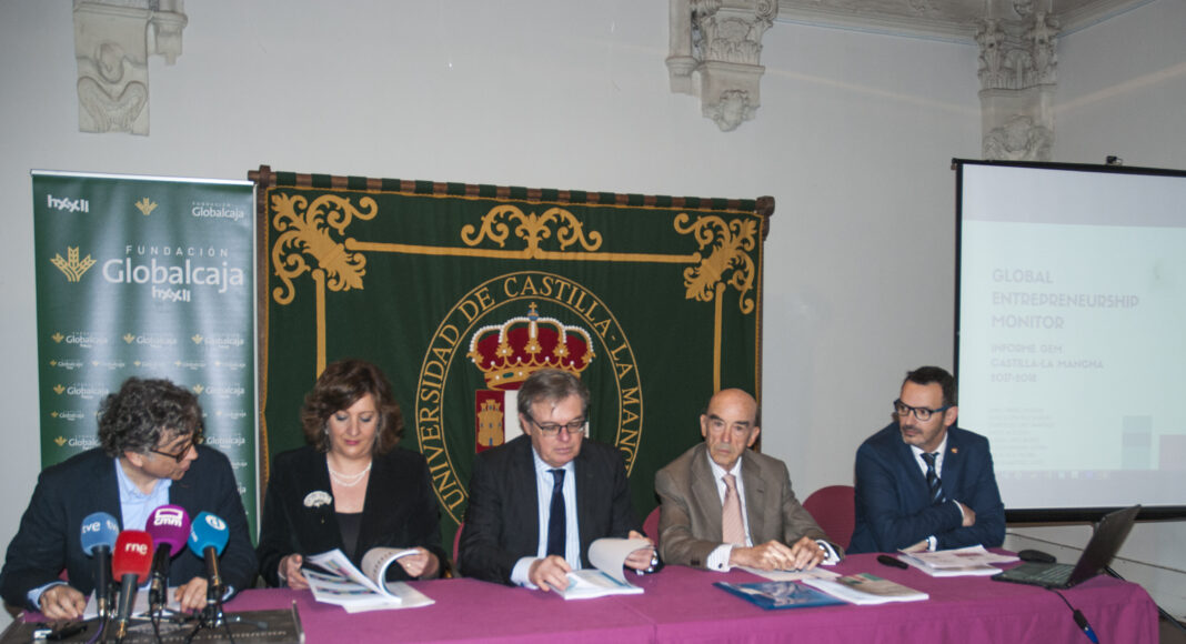 La Universidad de Castilla-La Mancha, la Fundación Globalcaja Horizonte XXII y la Junta de Comunidades han presentado esta mañana el Informe GEM (Global Entrepreneurship Monitor) Castilla-La Mancha en el Campus de Toledo, en un acto en el que han estado presentes presentes el rector, Miguel Ángel Collado; la consejera de Economía, Empresas y Empleo, Patricia Franco; el presidente de la fundación, Rafael Torres; además del director del informe Juan José Jiménez, y el integrante del equipo investigador, Francisco Sáez. Se trata del sexto año consecutivo en el que se lleva a cabo este informe, de carácter único, en Castilla-La Mancha.