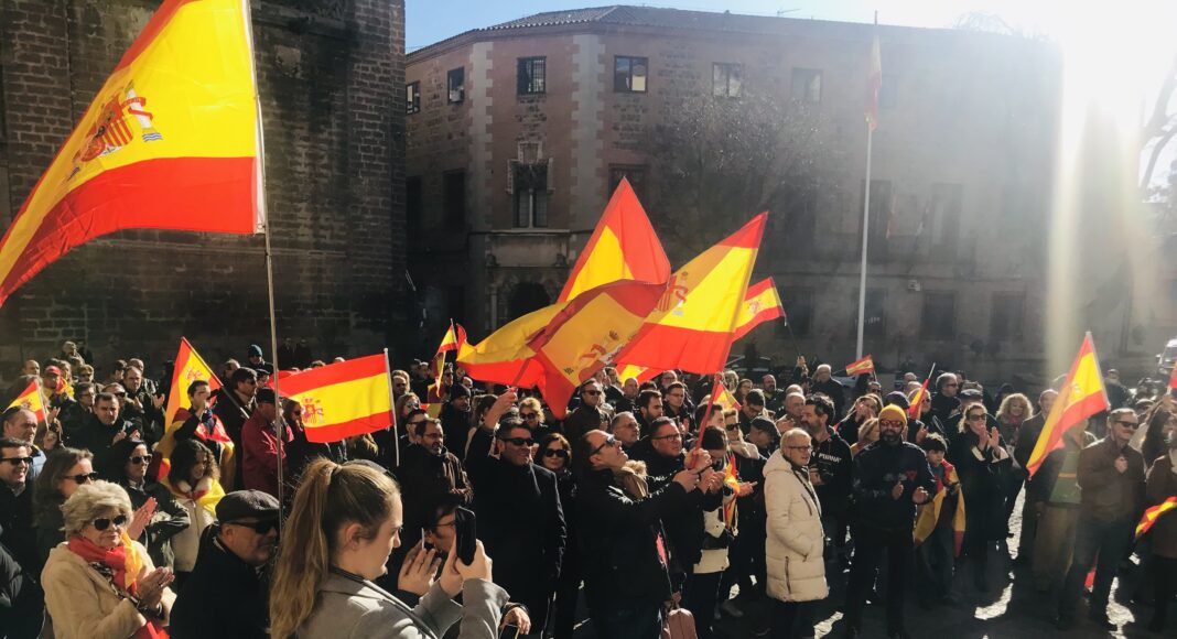 En Talavera de la Reina, el diputado de Vox Manuel Mariscal ha leído el manifiesto en la plaza del Pan en una concentración en la que han participado unas 300 personas portando banderas de España. La lectura del manifiesto ha terminado con el himno de España.