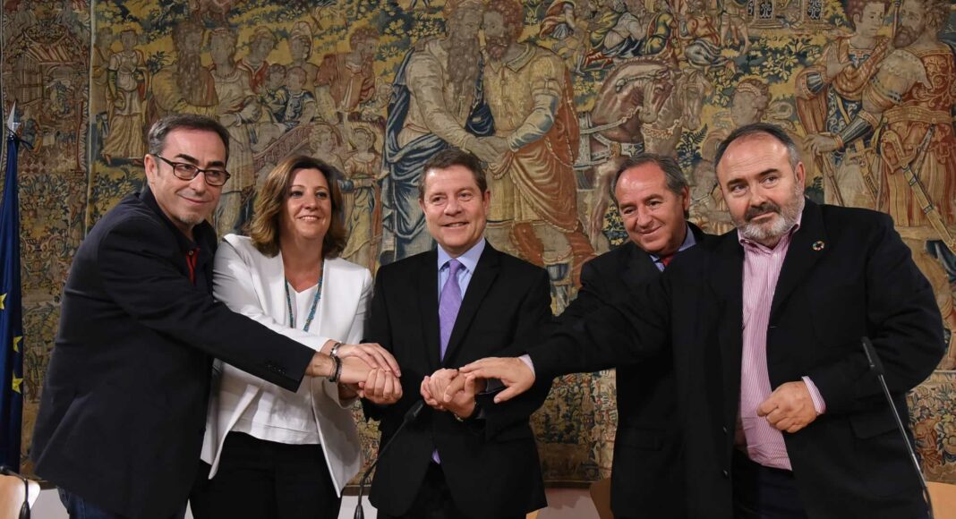El Gobierno de Castilla-La Mancha con Emiliano García-Page a la cabeza, la Confederación Empresarial de la región (Cecam) y los sindicatos CCOO y UGT han mantenido su primera reunión oficial de la legislatura, una cita en la que han suscrito una declaración institucional a lo largo de ocho ejes entre los que se encuentran el diálogo social, la cohesión territorial, el desarrollo sostenible o la lucha contra la despoblación.
