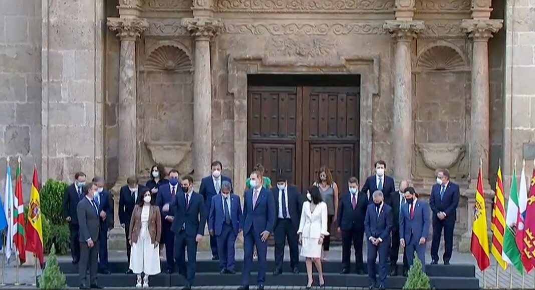 El presidente del Gobierno, Pedro Sánchez, y el Rey, Felipe VI, han llegado pasadas las 9.30 horas y, tras saludar a los presidentes autonómicos y el resto de miembros del Ejecutivo presentes, han posado juntos en la tradicional foto de familia, todos con sus mascarillas, algunas de ellas personalizadas, como la del presidente, con la bandera de España, o la del mandatario asturiano, Adrián Barbón, con la bandera del Principado.