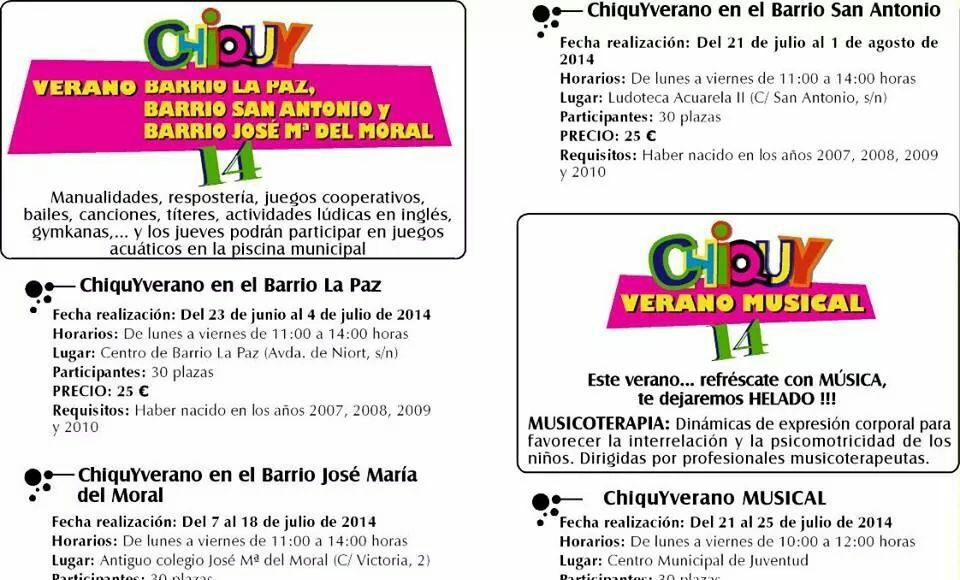 Hasta el 13 de junio está abierto el plazo de inscripción para el Chiquiverano 2014 que pondrá en marcha el Centro Municipal de Juventud. La actividad tendrá lugar en el centro de barrio La Paz del 23 de junio al 4 de julio, en el antiguo colegio José Mª del Moral del 7 al 18 de julio y en la ludoteca “Acuarela II” de la calle San Antonio del 21 de julio al 1 de agosto.