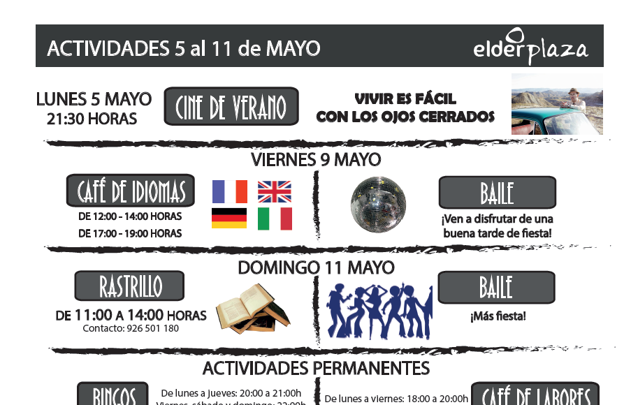 NoticiasSociedad Actividades del 5 al 11 y Talleres para mayo en Elder Plaza 04/05/2014 enTomelloso.com SociedadTomelloso Comparte FacebookTwitterPinterestWhatsApp Estas son las actividades de Elder Plaza durante la semana del 5 al 11 de mayo. Además. incluimos los talleres que se van a desarrollar durante este mes. enTomelloso.comhttps://entomelloso.com más de:elder plazaTomelloso + Noticias Más de 34.000 hogares reciben el Ingreso Mínimo Vital en Castilla-La Mancha Una foto a la semana Aquí pintamos todos Tomelloso Tomelloso rinde homenaje a seis docentes jubilados tras dejar huella a miles de estudiantes Tomelloso María Vicenta López Martínez, nueva jefa de Protección Civil de Tomelloso
