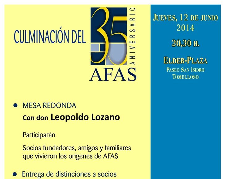 La Asociación de Familiares y Amigos de Personas con Discapacidad (AFAS) celebrará el próximo jueves, 12 de Junio, a las 20.30 h en Elder Plaza, una mesa redonda con D. Leopoldo Lozano, sacerdote de la parroquia de la Asunción y promotor ideológico de AFAS, en la que participarán socios fundadores, amigos y familiares que vivieron los origines de la constitución de AFAS, y que supone la culminación de los actos de celebración del 35 aniversario de la entidad.