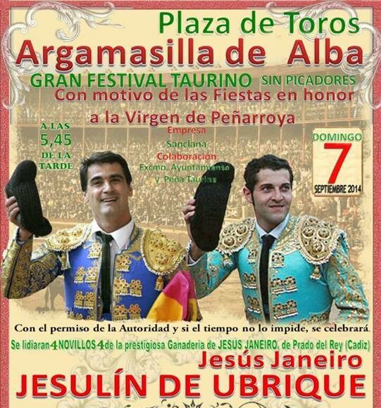 En primer lugar el domingo 7,  tendrá lugar el Gran Festival Taurino sin picadores, donde el conocido torero Jesulín de Ubrique y  el novillero, natural de Tomelloso, Antonio Linares, ofrecerán un mano a mano en el que lidiarán cuatro novillos de la ganadería de Jesús Janeiro. Seguidamente, se soltarán varias vaquillas para deleite de los aficionados.