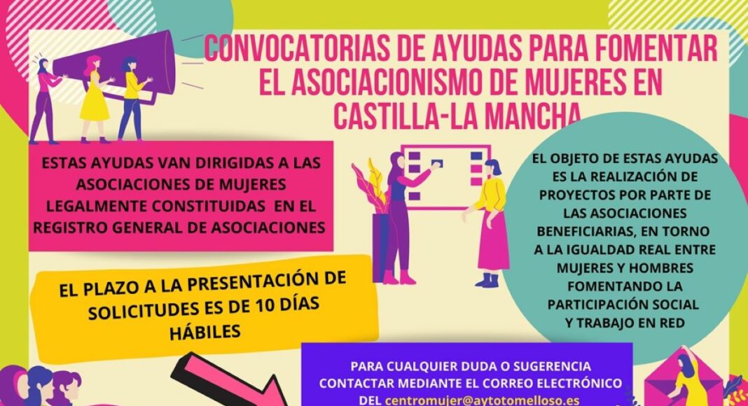 El Centro de la Mujer del Ayuntamiento de Tomelloso informa de la publicación, con fecha 12 de abril de 2021, de la Resolución 06/04/2021 del Instituto de la Mujer de Castilla La Mancha, por la que se convocan ayudas para fomentar el asociacionismo de mujeres en el año 2021.