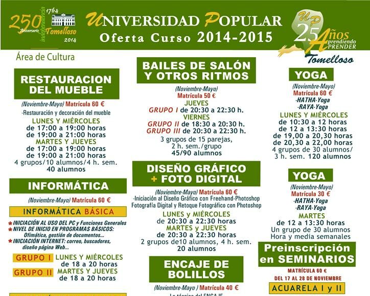 El resto del programa de la UP lo completan el taller de Dibujo y Pintura con 60 plazas convocadas que se iniciarán en técnicas múltiples y apuntes del natural; el taller de encaje de bolillos para 40 alumnos; el taller de restauración del mueble que también incluye decoración y 40 plazas convocadas; el taller de yoga, que incluye las técnicas de respiración, asanas –posturas- y relajación Hatha y las técnicas de concentración, atención mental y meditación Raya de 120 plazas; el curso de diseño gráfico y fotografía digital que incluye en el temario iniciación al diseño gráfico con Freehand-Photoshop, fotografía digital y retoque fotográfico con Photoshop, para 2 grupos de 10 alumnos y el taller de bailes de salón y otros ritmos que estará formado por 3 grupos de 15 parejas.