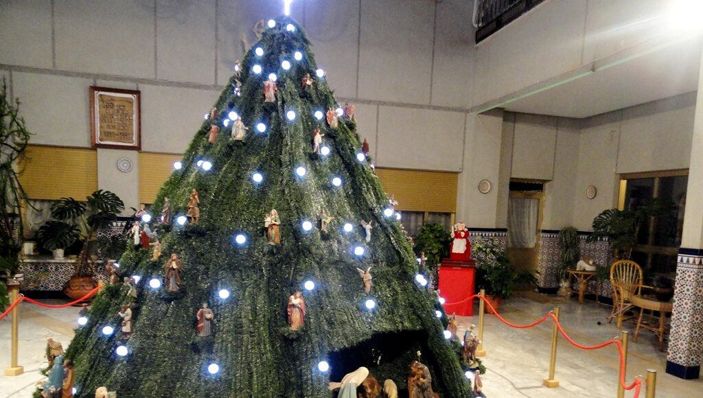 Un nuevo año nos encaminamos a la Residencia de Ancianos San Víctor, a ver el Belén. Una escueta tradición de dos veces, pero tradición al fin y a la postre, que estos días navideños son muy dados al acervo. En la portería preguntamos por Sor Teresa, mientras la requieren por megafonía pasamos al patio. Contemplamos sorprendidos el montaje: un inmenso abeto, con las figuras del Nacimiento instaladas en las laderas.