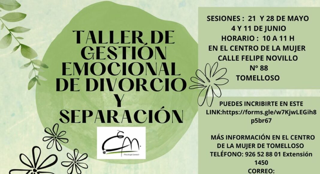 El Centro de la Mujer de Tomelloso ha programado un taller de Gestión Emocional de Divorcio y Separación que será impartido por Esther Mezcua, psicóloga, máster en psicología forense y especializada en custodia a menores. Se trata de una iniciativa orientada para las mujeres que están pasando por este proceso de separación y se sientan acogidas por una gran profesional. Las clases se impartirán en el aula de formación del Centro de la Mujer los días 21 y 28 de mayo, y 4 y 11 de junio en horario de 10 a 11 h.