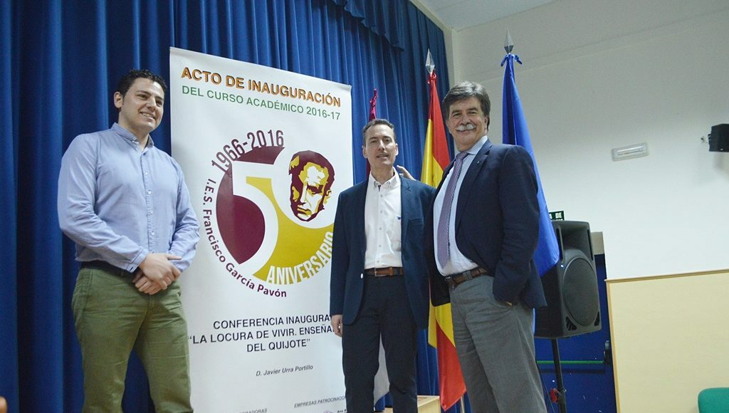 El Instituto Francisco García Pavón de Tomelloso celebró este jueves la inauguración del curso 2016/2017, el de su 50 Aniversario. Y lo hizo por todo lo alto, con la presencia del concejal de Educación, el portavoz del Grupo Popular, la presidenta de la Asociación de Empresarios, antiguos profesores, trabajadores y alumnos, el psicólogo que fue Defensor del Menor, Javier Urra ofreció la conferencia “La locura de vivir. Enseñanzas del Quijote”. Medio siglo de vida desde que el IES García Pavón abrió sus puertas en 1966 como Instituto Técnico.