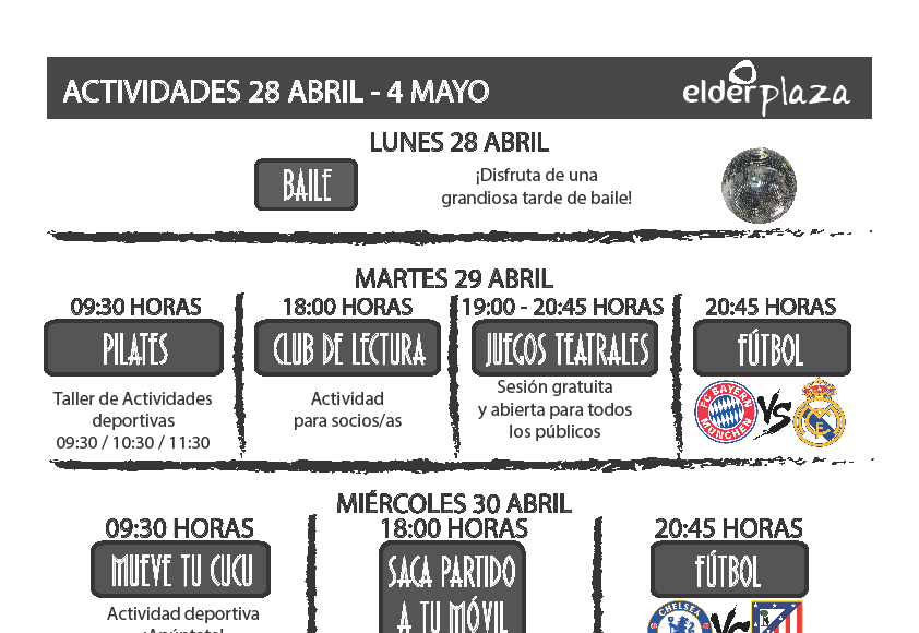 NoticiasSociedad Elder Plaza: Actividades del 28 de abril al 4 de mayo 28/04/2014 enTomelloso.com SociedadTomelloso Comparte FacebookTwitterPinterestWhatsApp Estas son las actividades de Elder Plaza para esta semana que comienza: enTomelloso.comhttps://entomelloso.com más de:elder plazaTomelloso + Noticias Más de 34.000 hogares reciben el Ingreso Mínimo Vital en Castilla-La Mancha Una foto a la semana Aquí pintamos todos Tomelloso Tomelloso rinde homenaje a seis docentes jubilados tras dejar huella a miles de estudiantes Tomelloso María Vicenta López Martínez, nueva jefa de Protección Civil de Tomelloso