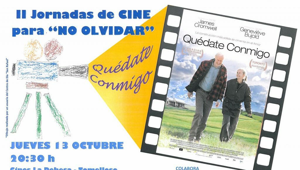 Con la proyección de la película “Quédate conmigo” en los Cines la Dehesa el próximo jueves 13 de octubre a las 20:30, la Asociación de Alzheimer de Tomelloso (AFAL) quiere dar continuidad a las “Jornadas de Cine para no Olvidar” que iniciamos en 2014. En dichas jornadas quieren dar visibilidad y normalidad a la enfermedad a través del cine, aprovechando que son numerosos los directores que en los últimos años se han hecho eco en sus películas de la enfermedad de Alzheimer, ya sea como temática principal o como historia de fondo.