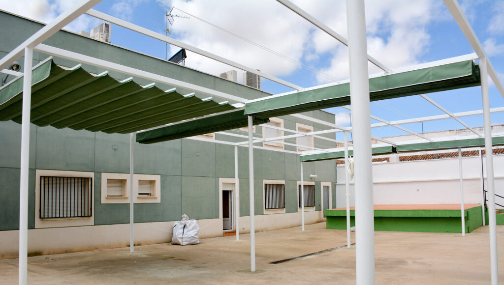 Ha sido una actuación financiada con fondos propios municipales que consiste en una estructura metálica que cubre todo el patio exterior y que cuenta con un sistema muy sencillo para que los toldos sean desplegados.