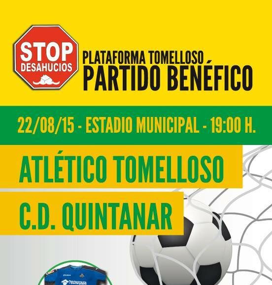 La Plataforma de Afectados por la Hipoteca será la beneficiaria del encuentro solidario que se disputa el sábado 22 de agosto en Tomelloso. La recaudación íntegra del partido se destinará a esta organización social, un dinero que se sumará a lo que se recaude del sorteo de una camiseta del Getafe C.F. firmada por toda la plantilla de este equipo de Primera.