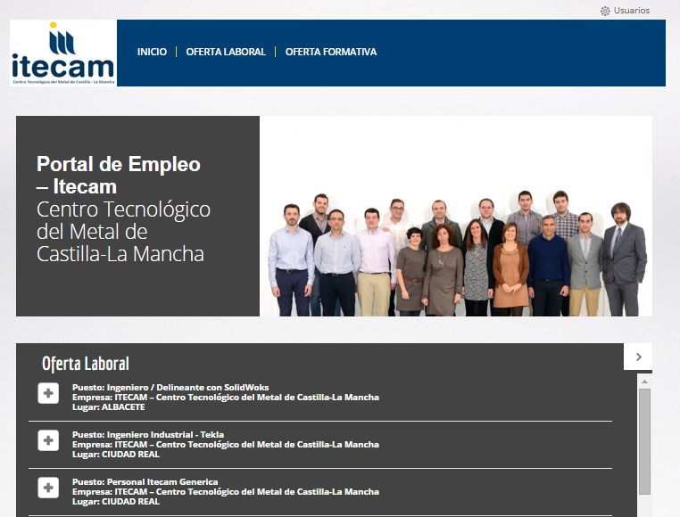 Para facilitar esta labor de intermediación, se ha puesto en marcha un portal de empleo (https://itecam.iformalia.es), al que se accede previa inscripción. El objetivo es facilitar un punto de encuentro entre la oferta y la demanda de empleo, bien del propio Centro Tecnológico o de sus empresas asociadas.