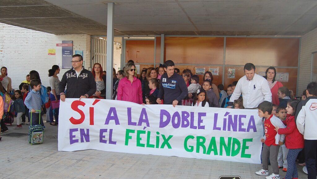 Varias decenas de alumnos y algunos adultos se han quedado a la entrada de la escuela durante el periodo señalado para la protesta junto a una pancarta en la que se leía «Sí a la doble línea en el Félix Grande»