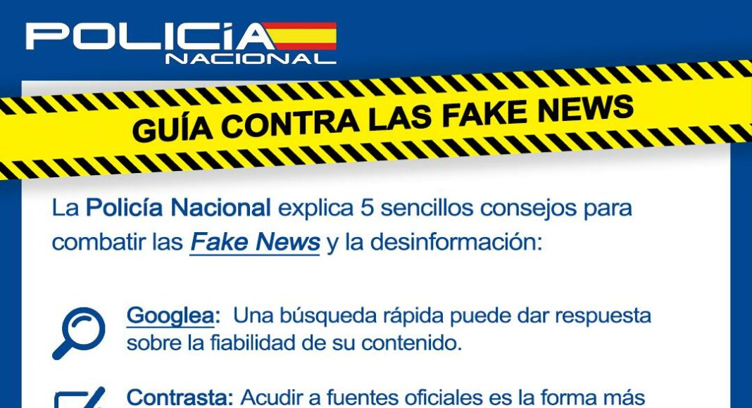 La Policía Nacional presenta la primera guía para impedir ser manipulados por las fake news: “Blinda tus perfiles contra las fake news”, una herramienta para evitar ser cómplice de la desinformación. Se trata de una guía con cinco recomendaciones sencillas a disposición de los ciudadanos que nos ayuda a saber cuándo nos encontramos ante este tipo de noticias para que podamos identificarlas antes de darles credibilidad y compartirlas.