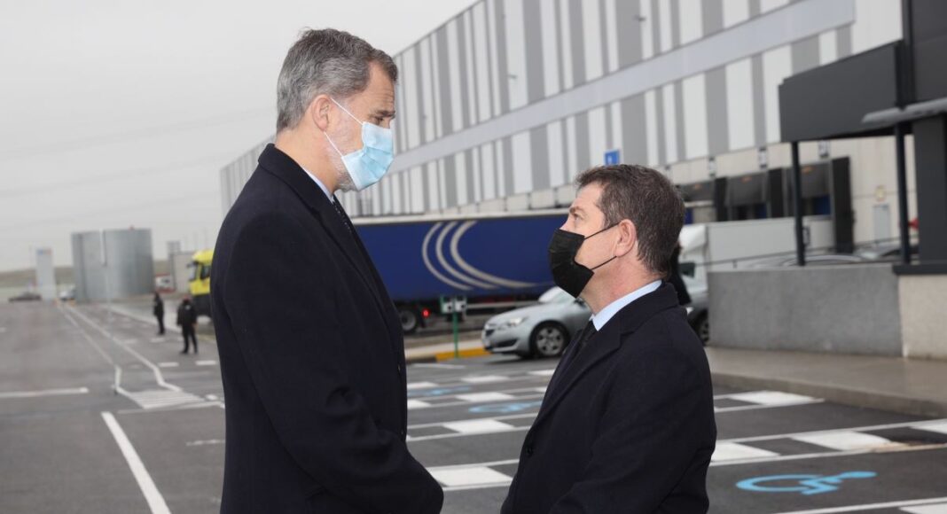 Precisamente, el Rey Felipe VI que visitó este lunes la nave de SEUR Logística en Illescas tuvo ocasión de expresar sus condolencias al presidente de Castilla-La Mancha, que se acercó unos minutos antes del acto a saludarlo.