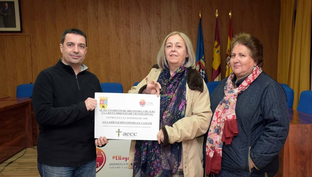 El concejal de Cultura de Argamasilla de Alba, José Antonio Navarro, ha hecho entrega a las representantes de la AECC de la localidad, Amparo Jiménez y Lourdes Sáez, de los 384 euros recaudados en el concierto benéfico ‘Melodías solidarias’, ofrecido en el Teatro-Auditorio en los días previos a la Navidad por la Joven Orquesta de Vientos de Argamasilla de Alba (JOVAL), dirigida por Miguel Carlos Gómez Perona. Una donación que fue aprobada por la Junta de Gobierno local, a propuesta del área de Cultura.