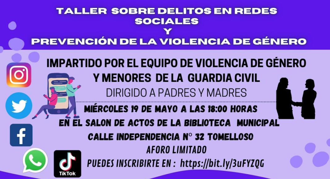 El taller, dirigido a padres y madres, será impartido por el equipo de violencia de género y menores de la Guardia Civil en el salón de actos de la Biblioteca Municipal. Comenzará a las 18:00 horas y para asistir es necesario inscribirse previamente a través del siguiente enlace: https://bit.ly/3uFYZQG . El aforo es limitado