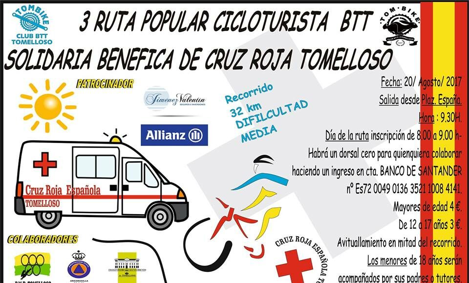 Este domingo, a partir de las 9.30 horas en Tomelloso se podrá participar en la ‘3ª Ruta cicloturista solidaria’, a beneficio de Cruz Roja Española. Esta actividad, tendrá una duración aproximada de tres horas y está organizada por el Club BTT Tom-Bike.