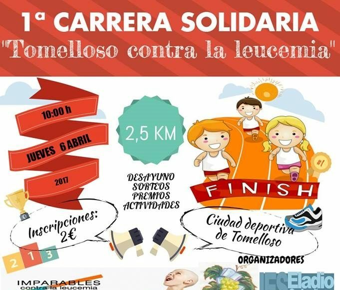 El próximo jueves 6 de abril se celebrará una carrera solidaria cuyo objetivo principal es recaudar fondos para la fundación Josep Carreras y la lucha contra la leucemia.  La prueba se desarrollará en la Ciudad Deportiva de Tomelloso sobre un recorrido de 2,5 kilómetros. Después, habrá un desayuno saludable y distintos sorteos y actividades.