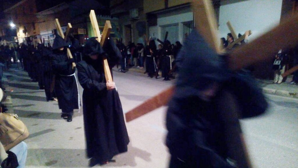 Varios centenares de cofrades, ataviados con una túnica franciscana, cubiertos con el capuz, cabizbajos y mudos, llevaban a cabo esta Estación de Penitencia, sin duda, la procesión más característica de la Semana Santa de Tomelloso. Desfilaron con su paso titular: la Gran Cruz Expiatoria del Pueblo.
