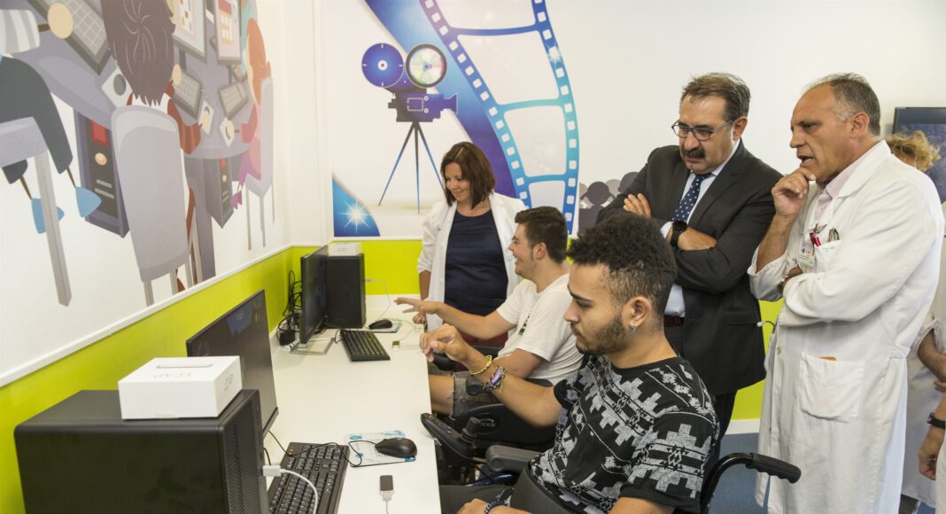Un videojuego de ordenador que permite realizar ejercicios con la mano y ver su movimiento en la pantalla mientras realizas diferentes misiones es una de las actividades que pacientes jóvenes del Hospital Nacional de Parapléjicos pueden llevar a cabo en el nuevo espacio cultural y de ocio virtual que ha comenzado a funcionar en el centro.