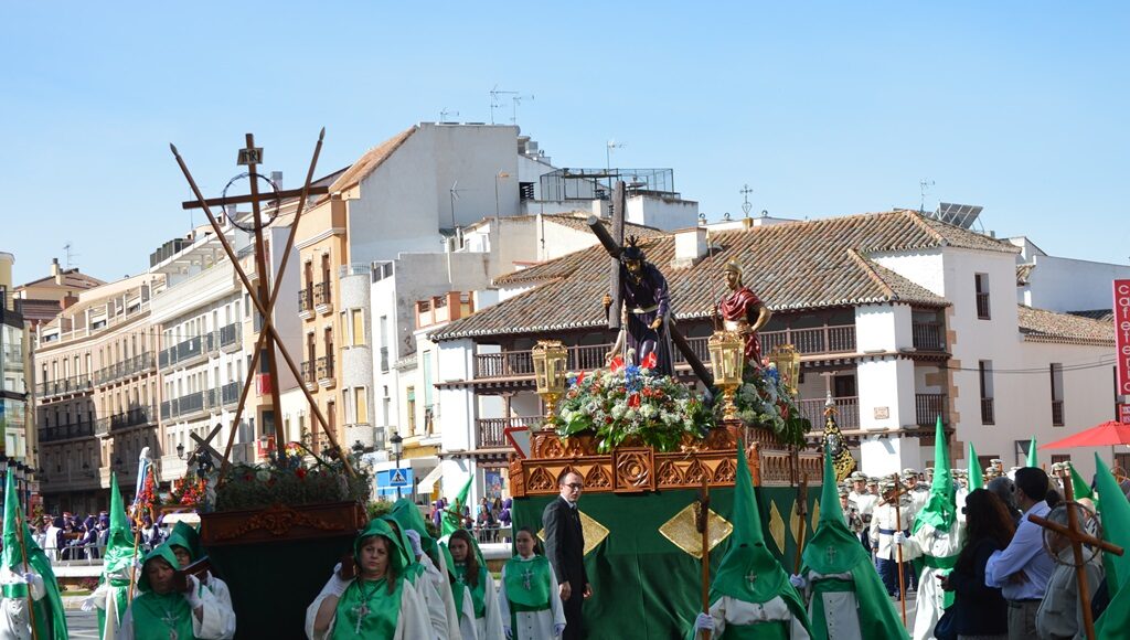 Magnifica mañana de Viernes Santo, primaveral. Los tomelloseros y visitantes se han echado a la calle, arreglados, como es costumbre, para ver pasar la Procesión “Camino del Calvario”. Viernes Santo (junto con la Romería y la noche de la pólvora) es el día que más gente sale a la calle en Tomelloso.