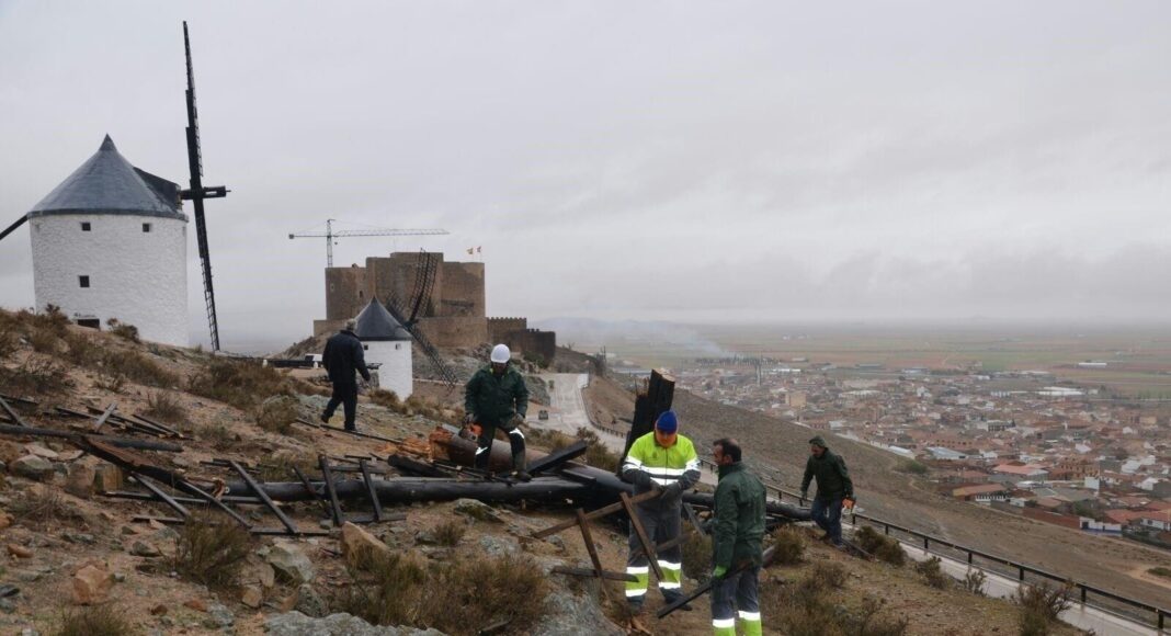 El municipio toledano de Consuegra ha consumado su petición al Gobierno central para declarar el municipio como «zona afectada gravemente por emergencias de protección civil» tras los daños ocasionados la semana pasada por el temporal de viento, que azotó a la localidad tanto en los históricos molinos que coronan el Cerro Calderico como en la instalaciones municipales.