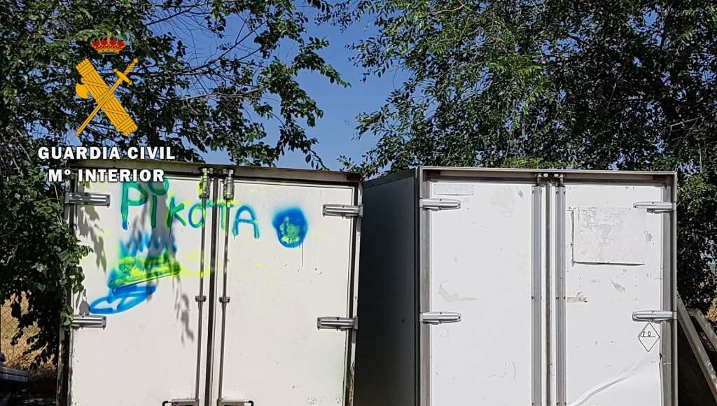 Los agentes comprobaron que otras cuatro cajas de camión, así como el camión sin desguazar, habían sido sustraídos en distintas localidades de las provincias de Toledo y Madrid. La Guardia Civil también halló en el interior de esta finca un perro mastín muerto y encadenado en avanzado estado de descomposición.