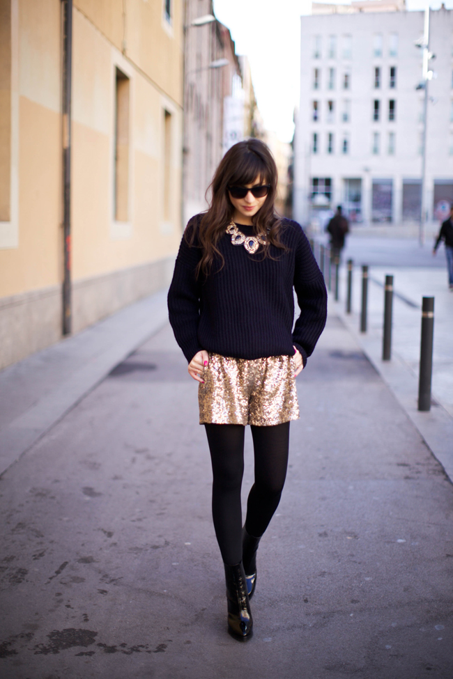 ¿Y sí te da por sacar los pantalones de noche vieja? ¡Pues venga valor y a dejar la silla de la oficina repleta de lentejuelas! Pero eso si compénsalo con medias tupidas, botines del mismo color que la media y un jersey monjil, se te permite un collar de quiero y no puedo del mismo tono que el pantalón para que tus compis de oficina tengan dos cosas que criticarte y no se ceben solo con una.