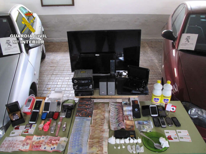 En la localidad de La Solana (Ciudad Real), se hallaron 84 gramos de cocaína preparada en dosis de 10 gramos, 791.000 pesos colombianos, 1.805 euros, 10 teléfonos móviles, material informático y otros medios electrónicos.